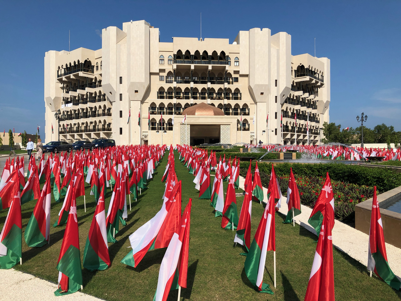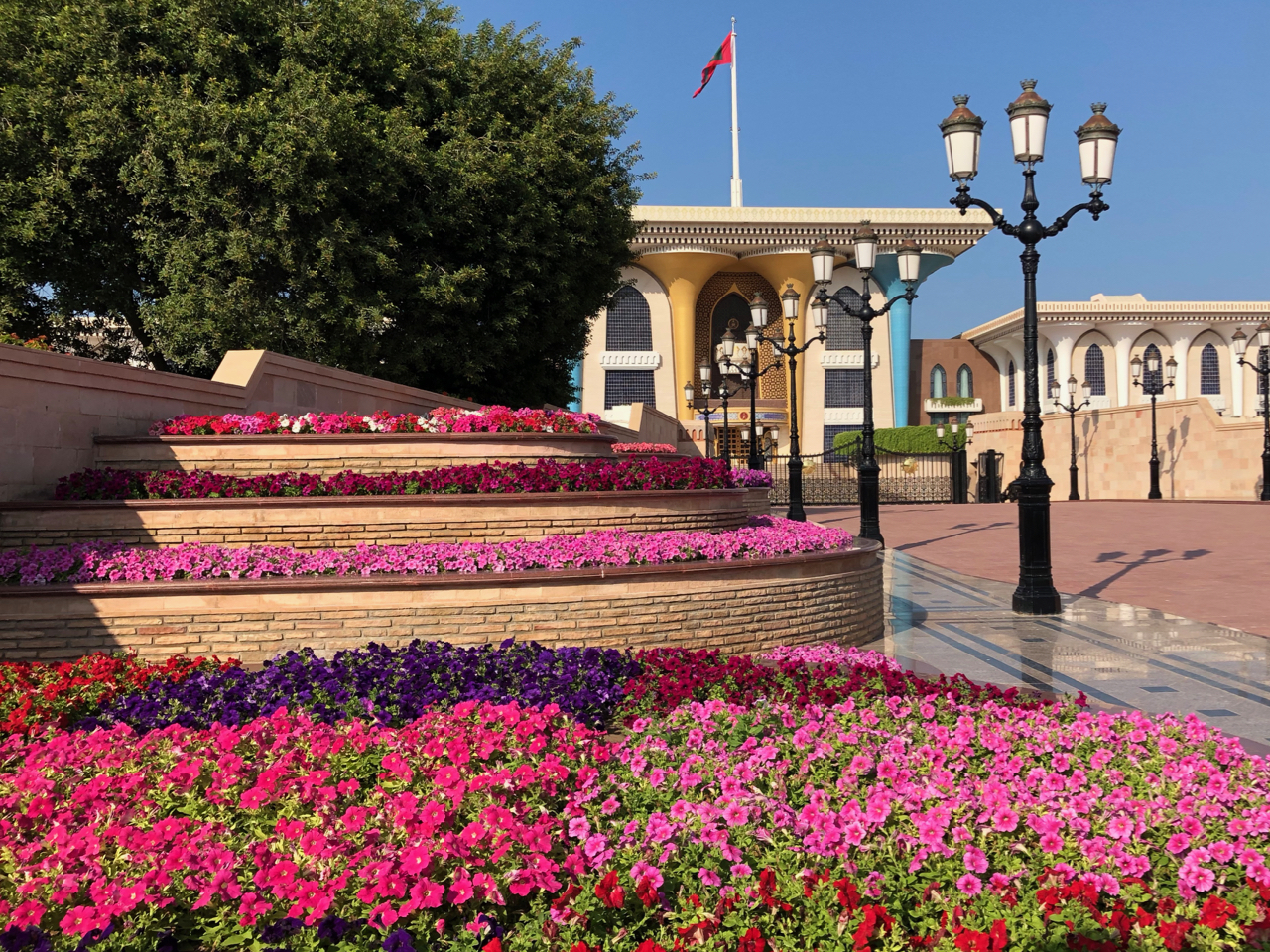 Wir dagegen starteten unseren Ausflug in Muscat erst um 10:00 Uhr und charterten dazu einen Kleinbus Mit Fahrer. Dieser fuhr uns zunächst zur Besichtigung der Moschee, da diese bereits um 11:00 Uhr geschlossen wurden. Danach fuhren wir zu einem Beach und kamen dabei rein zufällig bei dem Grand Hyatt Hotel vorbei, wo wir 2005 unseren Urlaub im Oman verbracht haben. Weiter ging es zum Theater mit einer sehr exklusiven Einkaufspassage und anschließend zum Bustan Palast, wo wir wieder den leckeren Tee tranken. Mit einem weiteren kurzen Stop am Sultanspalast ging es zurück zum Schiff. Der ganze Ausflug kostete uns für 9 Personen und 5 Stunden 250€.