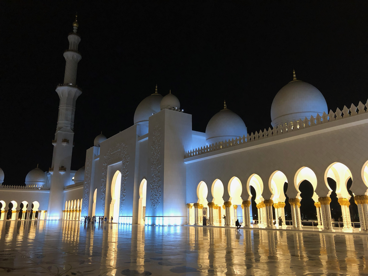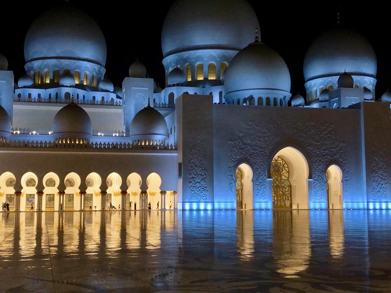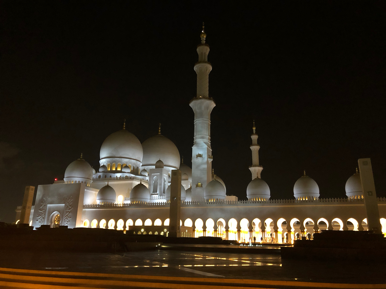 Danach ging es mit zwei Taxen zur Sheikh Zayed Moschee, die ca. 28 Kilometer entfernt liegt. Wir erleben diese beeindruckende Moschee bei abendlicher Beleuchtung. Nach dem Moschee Besuch wollen wir noch eine Bar aufsuchen, was uns auf Umwegen auch gelingt. Wir landen schließlich im 62. Stockwerk des Jumeirah Etihad Tower.