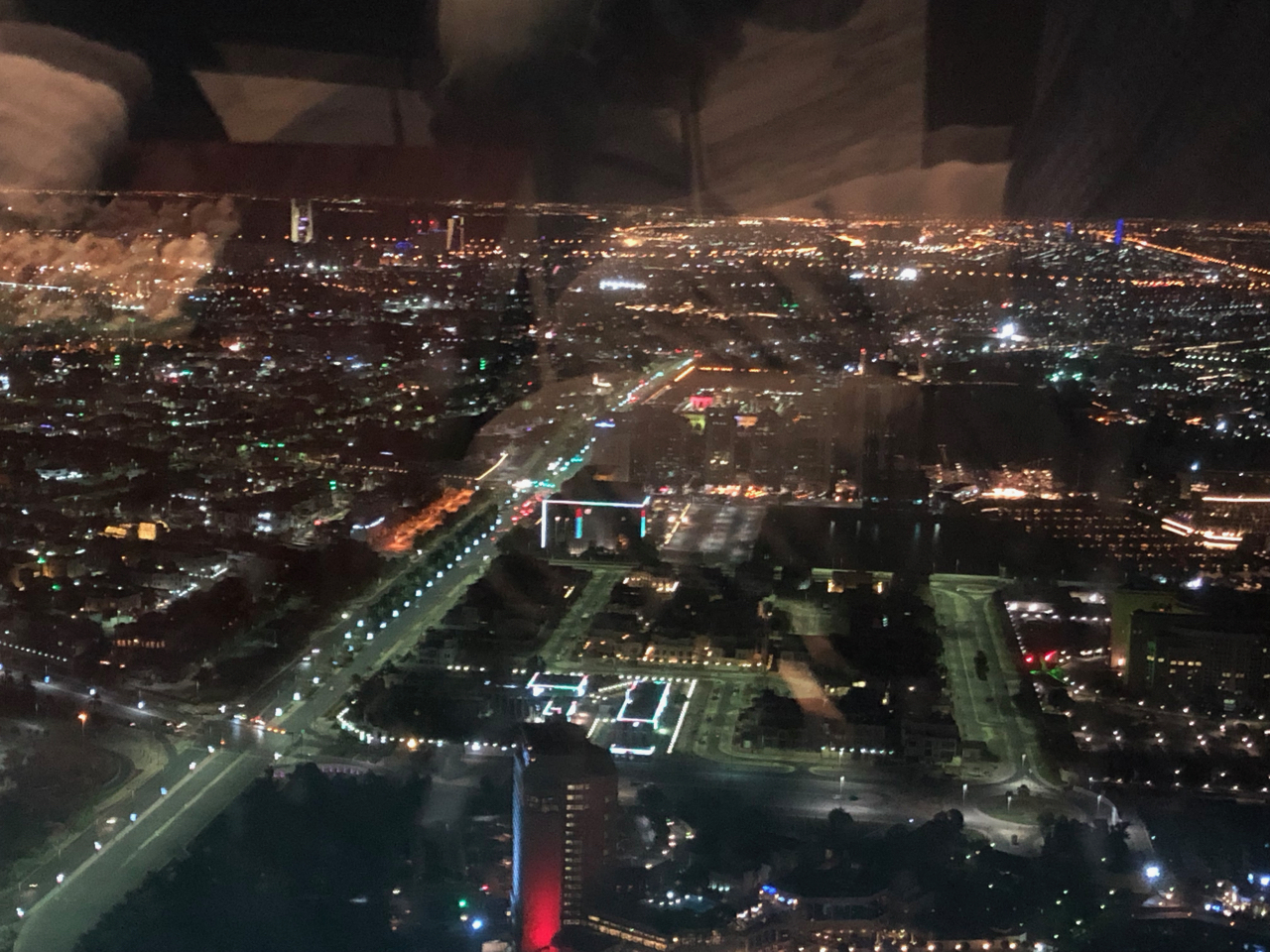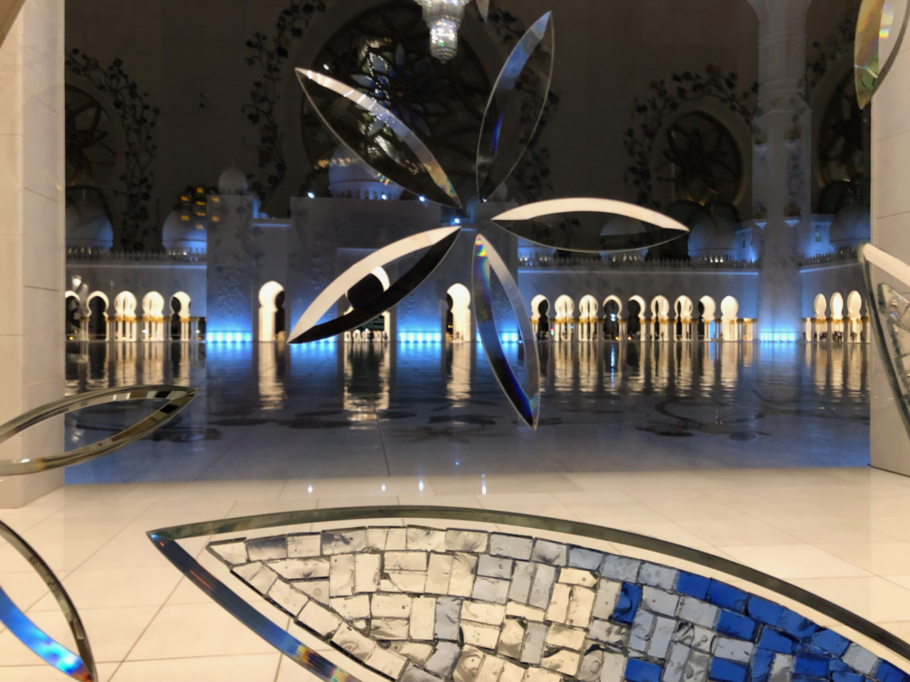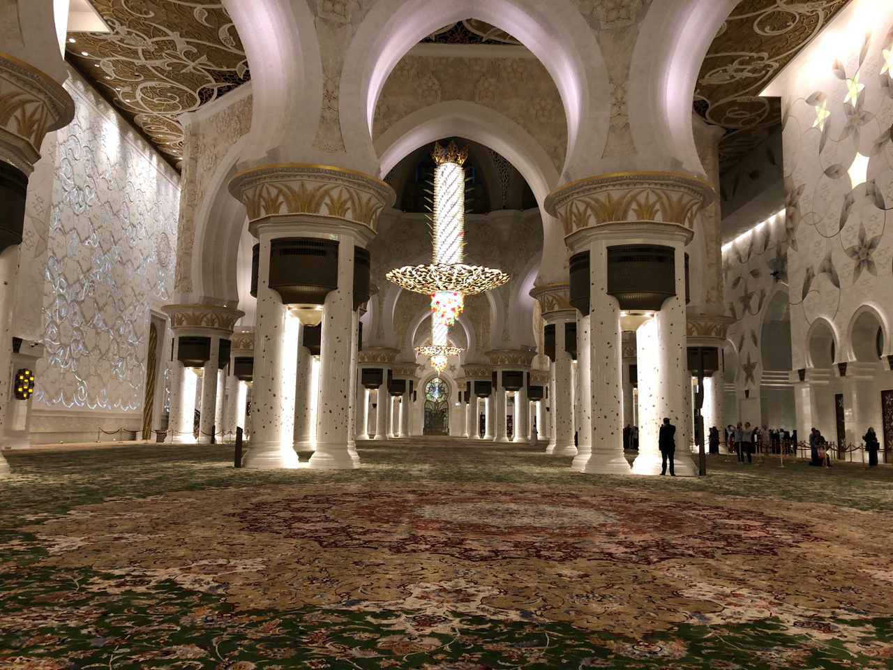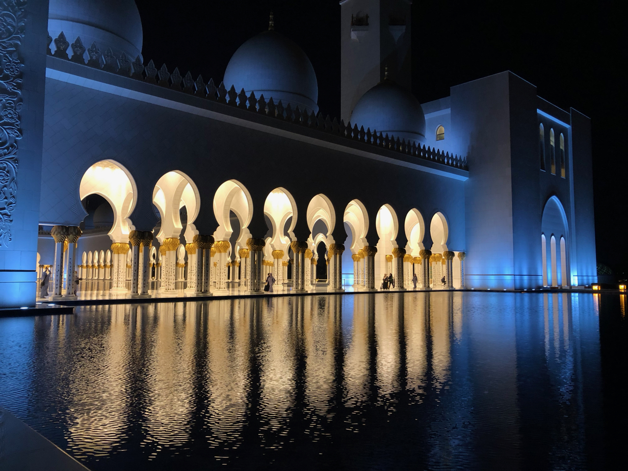 Danach ging es mit zwei Taxen zur Sheikh Zayed Moschee, die ca. 28 Kilometer entfernt liegt. Wir erleben diese beeindruckende Moschee bei abendlicher Beleuchtung. Nach dem Moschee Besuch wollen wir noch eine Bar aufsuchen, was uns auf Umwegen auch gelingt. Wir landen schließlich im 62. Stockwerk des Jumeirah Etihad Tower.