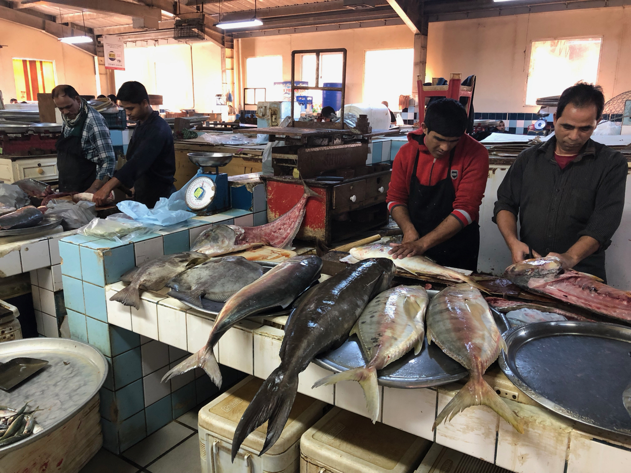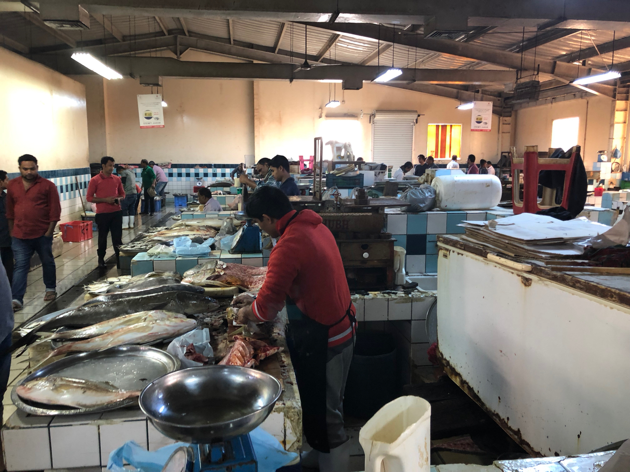 Wir sollten diese Entscheidung nicht bereuen, denn es wurde ein sehr schöner Ausflug. Schnell hatten wir auf unserem Weg durch die Souks die allgemeinen Touristenströme verlassen und fanden uns in einer typisch arabischen Szene wieder. Geschickt von unseren Handy geleitet kamen wir schließlich zu den Markthallen. In der Halle für Gemüse wurden wir von einem Markthändler sehr freundlich gebeten, an einem sehr einfachen Tischplatz Platz zu nehmen und uns von seinen Spezialitäten und Tee verwöhnen zu lassen. So haben wir für 20 US-$ mit zehn Leuten einen sehr leckeren landestypischen Imbiss erhalten. Weitere Frauen waren in der Halle Fehlanzeige.