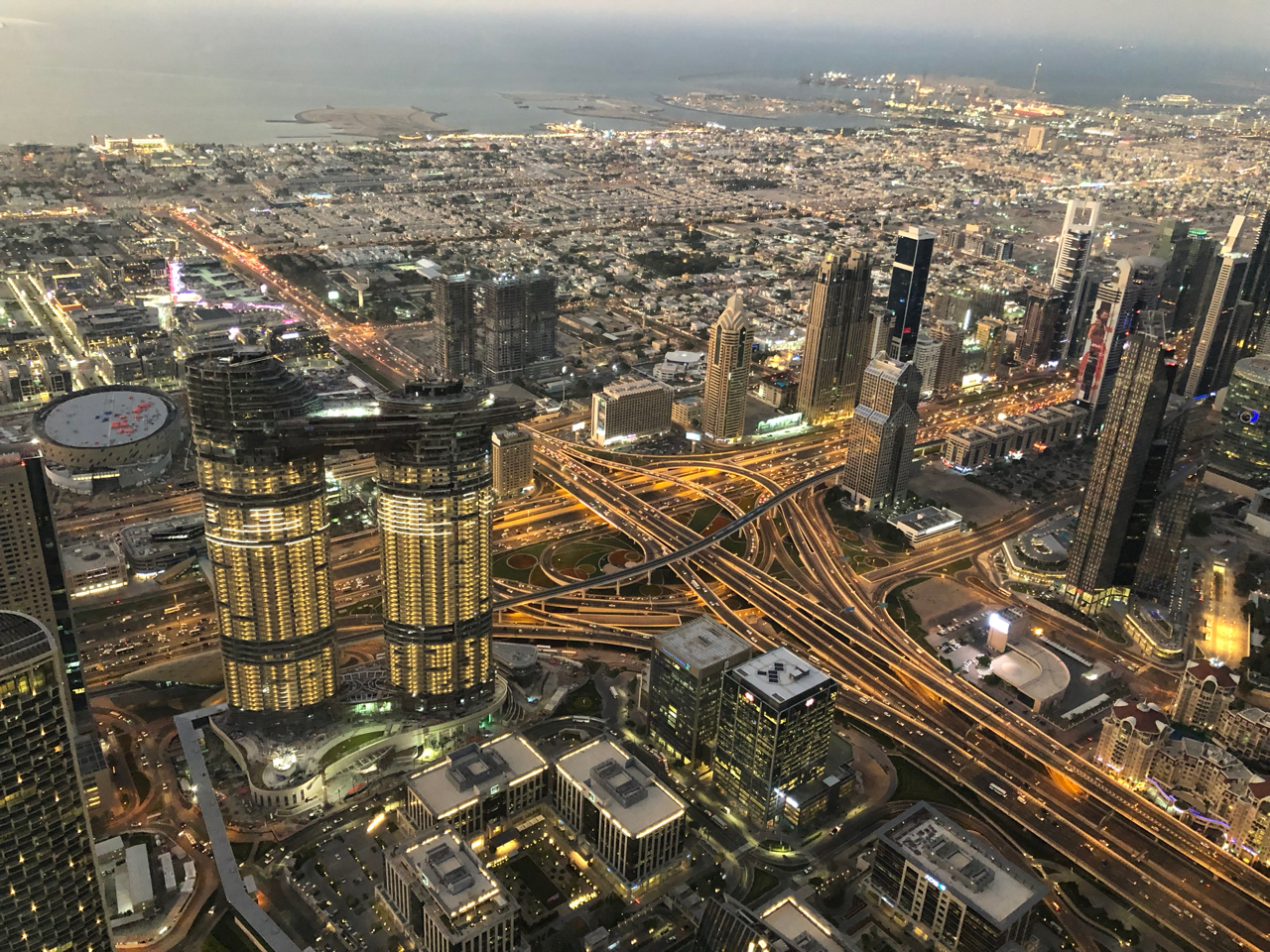 Nach längerer Begrüßungszeremonie am Check out ging es mit einem Minibus zunächst zum Burj al Arab, den wir vom Strand aus in Augenschein nahmen. Weiter ging es zum Madinat Jumeirah. Dort stromerten wir durch den kleinen Hotel Souk und nahmen die künstlich angelegte Lagune in Augenschein. Als nächstes kamen wir zum neu angelegten Dubai Marina mit seinem künstlichen Hafenbecken gesäumt von riesigen Wolkenkratzern. Schließlich landeten wir an dem künstlich angelegten Creek, der demnächst noch mit dem natürlichen Creek verbunden werden soll. Pünktlich zum Sonnenuntergang waren wir auf der Aussichtsplattform des Burj Khalifa. Von hier bot sich bald ein herrlicher Blick auf das beleuchtete Dubai bei Nacht. Zum Abendessen waren wir wieder auf dem Schiff.