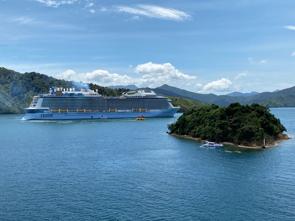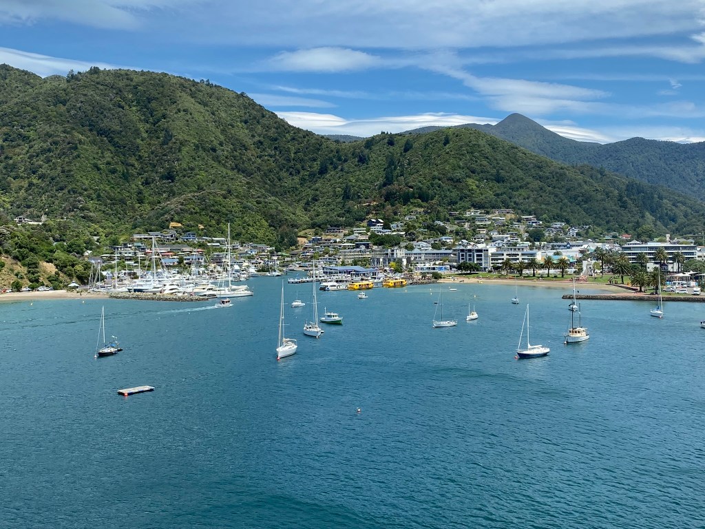 Wegen des kräftigen Windes werden wir gebeten, unter Deck zu gehen. Stürmischer Wind ja, hohe Wellen Fehlanzeige. Gut eine Stunde später erreichen wir die windgeschützten Fjorde der Südinsel, die Marlborough Sounds und es heißt wieder, an Deck gehen, Sonne und den tollen Ausblick genießen.