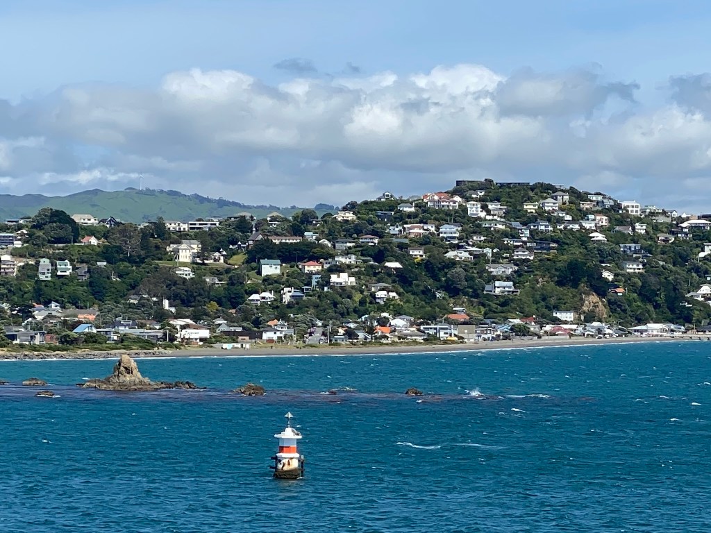 Wieder ein herrlicher Tag, allerdings sind für die Cook-Street heftige Böen angesagt. Nach dem ruhigen Auslaufen und letzten Blicken auf die Hauptstadt setzen die auch prompt beim Erreichen der letzten Felsen, dem Barrett Reef ein. Dort sank 1968 die einlaufende Fähre Wahine bei einem Orkan vor den Augen der an Land hilflos zuschauen müssenden Hilfskräfte und Einwohnern der Stadt. 53 Menschen kamen zu Tode.