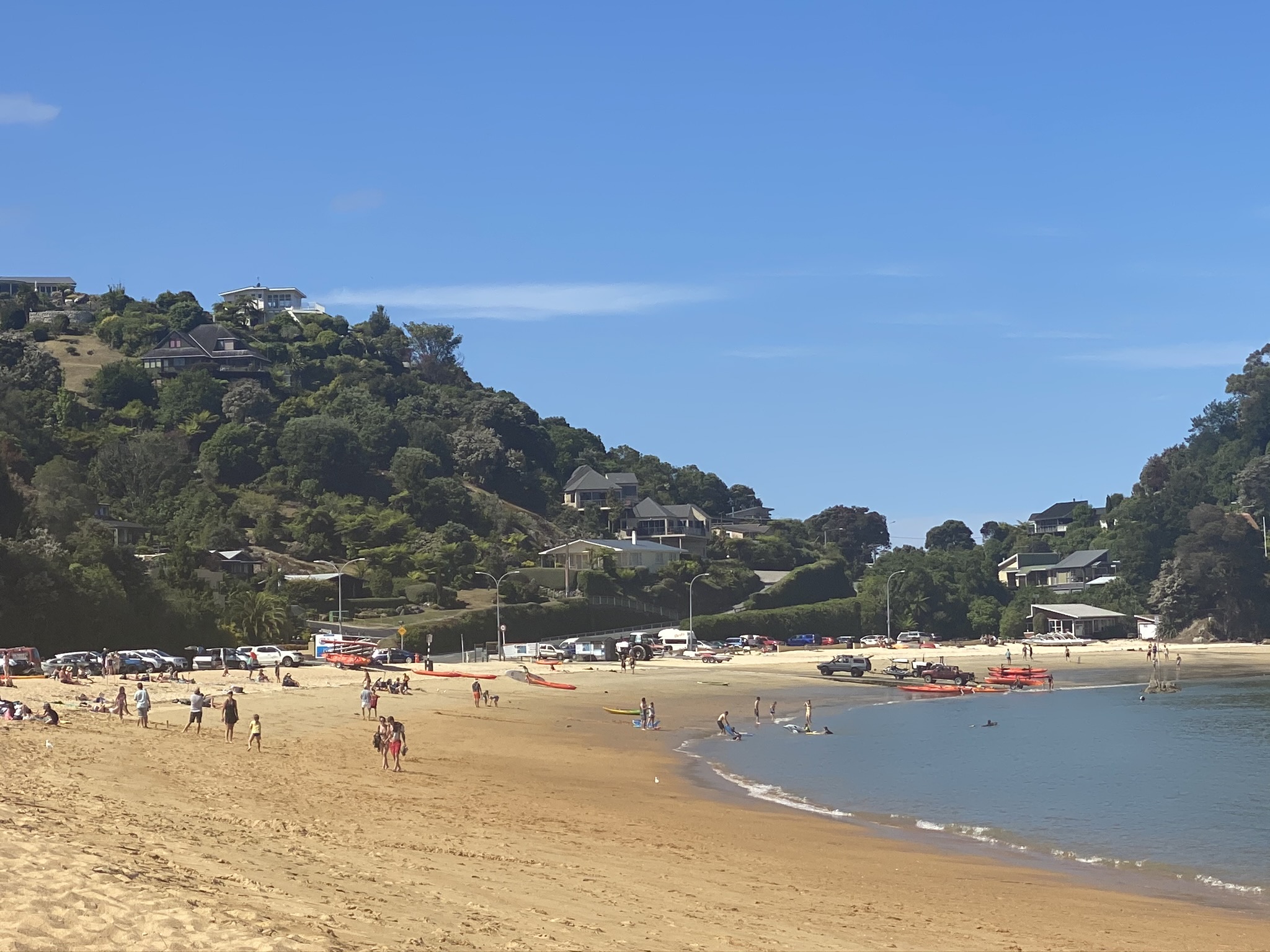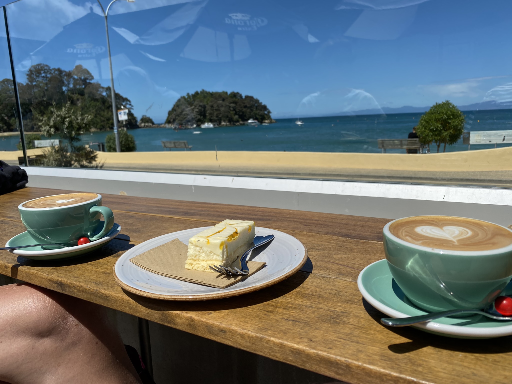 Kaum sind wir wieder in Kaiteriteri angekommen und genießen Café Latte und Cheesecake mit Passionsfrucht im Straßencafé bei dezenter Live Musik und mit bestem Blick auf Strand und Leute, da kommt die Sonne mit voller Wucht hervor. Da muss man einfach an den herrlichen Strand und im sauberen Meerwasser baden. Einfach super !