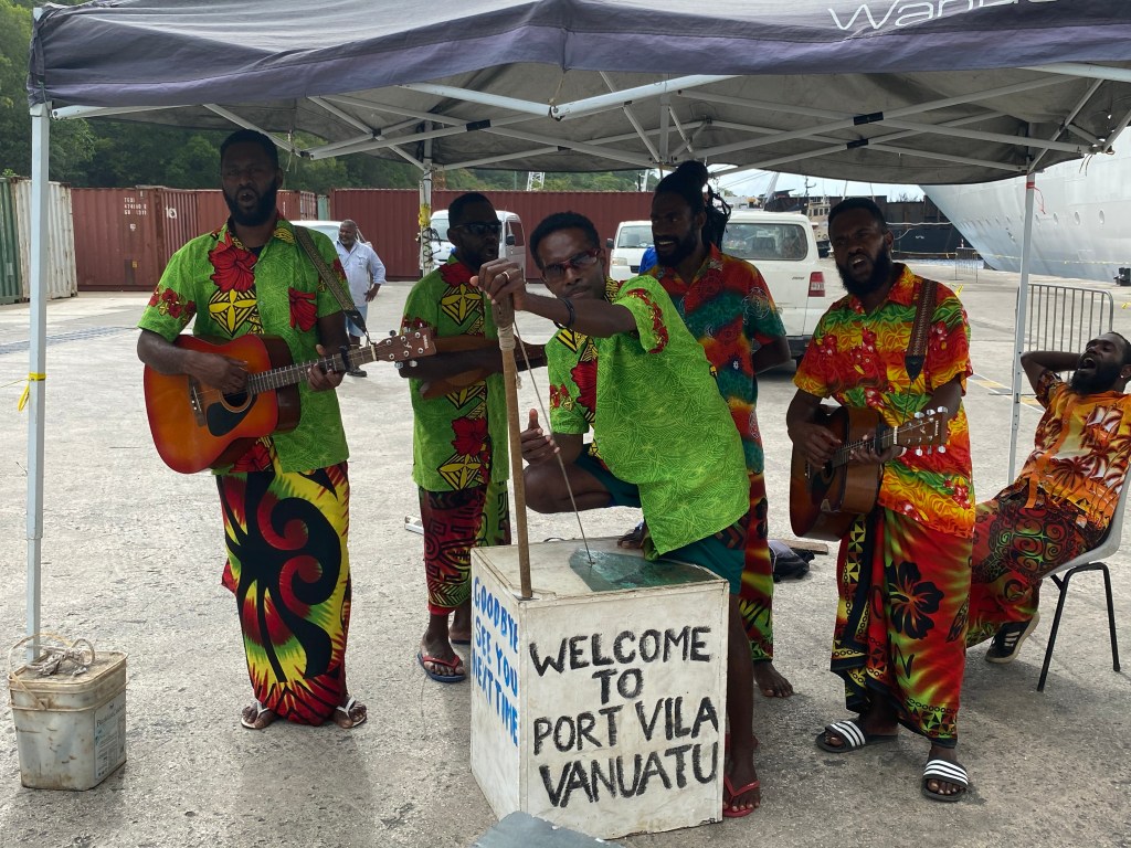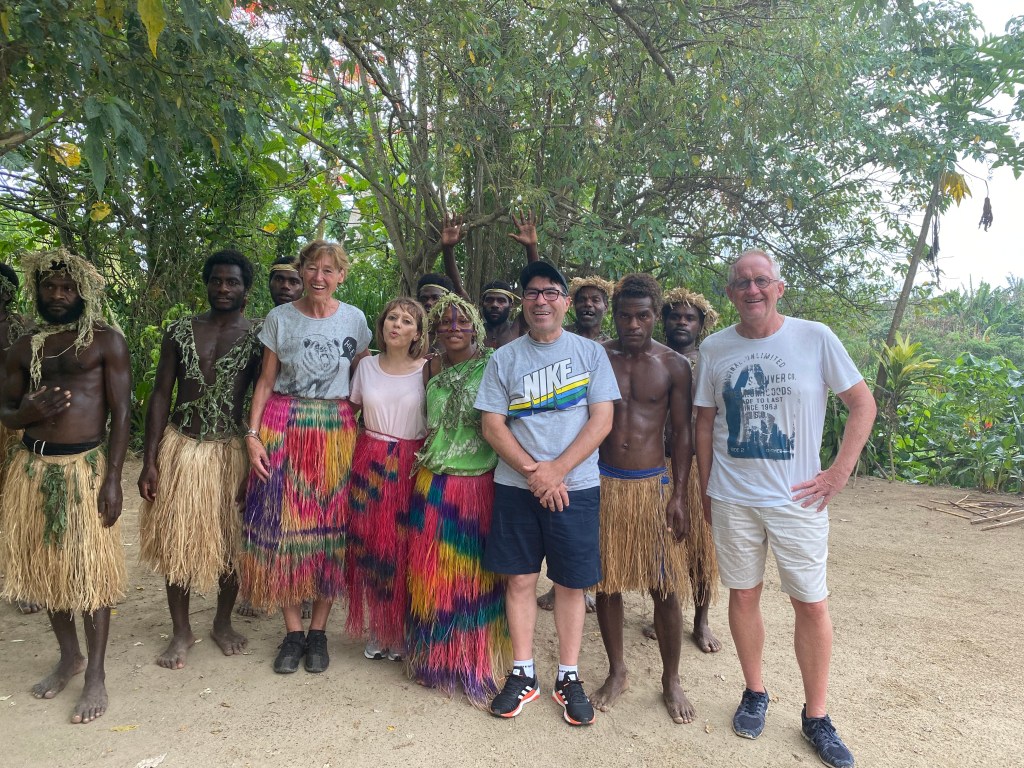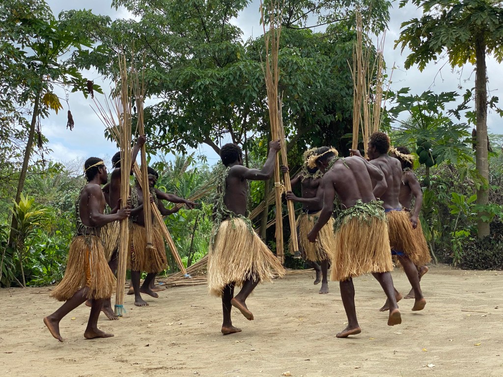Am nächsten Tag ist Port Vila unser Ziel, die Hauptstadt Vanuatus. Wenn man von Bord geht, muss man sich durch ein scheinbar nicht nicht endendes Spalier von morgens aufgebauten Marktständen zwängen, deren Angebot zumeist aus chinesischer Billigproduktion an Kleidern, Schmuck und Reisesouvenirs besteht, die sich ständig wiederholen und unser Kaufinteresse nicht erwecken. Dazwischen wird man von einheimischen Taxi- und Minibusfahrern bedrängt, sich von ihnen zu den Hauptattraktionen der Insel kutschieren zu lassen. Wir treffen dabei zufällig zwei Australier aus Sydney und verhandeln gemeinsam einen Preis mit Alfred, der uns zu einem Culture Village, der Blauen Lagune und den Wasserfällen fahren wird. Mit dem Minibus geht heraus in die grüne, recht trockene Landschaft. Mittendrin biegen wir plötzlich auf einen provisorischen Parkplatz ab. Wir vier sind die einzigen Gäste der nun folgenden „Kulturveranstaltung“. Der Häuptling führt uns zum zentralen Platz, vor dessen Erreichen wir aber erstmal von ein paar mit Sperren ausgestatteten und laut aufschreienden Kriegern gehörig erschreckt werden. Wir merken aber bald, dass die Bewohner von Vanuatu nicht ohne Grund zu den freundlichsten und glücklichsten Bewohnern unserer Erde gezählt werden. In der nächsten halben Stunde erfahren wir viel vom Chief über die traditionelle Lebensweise und Tänze der Insulaner.