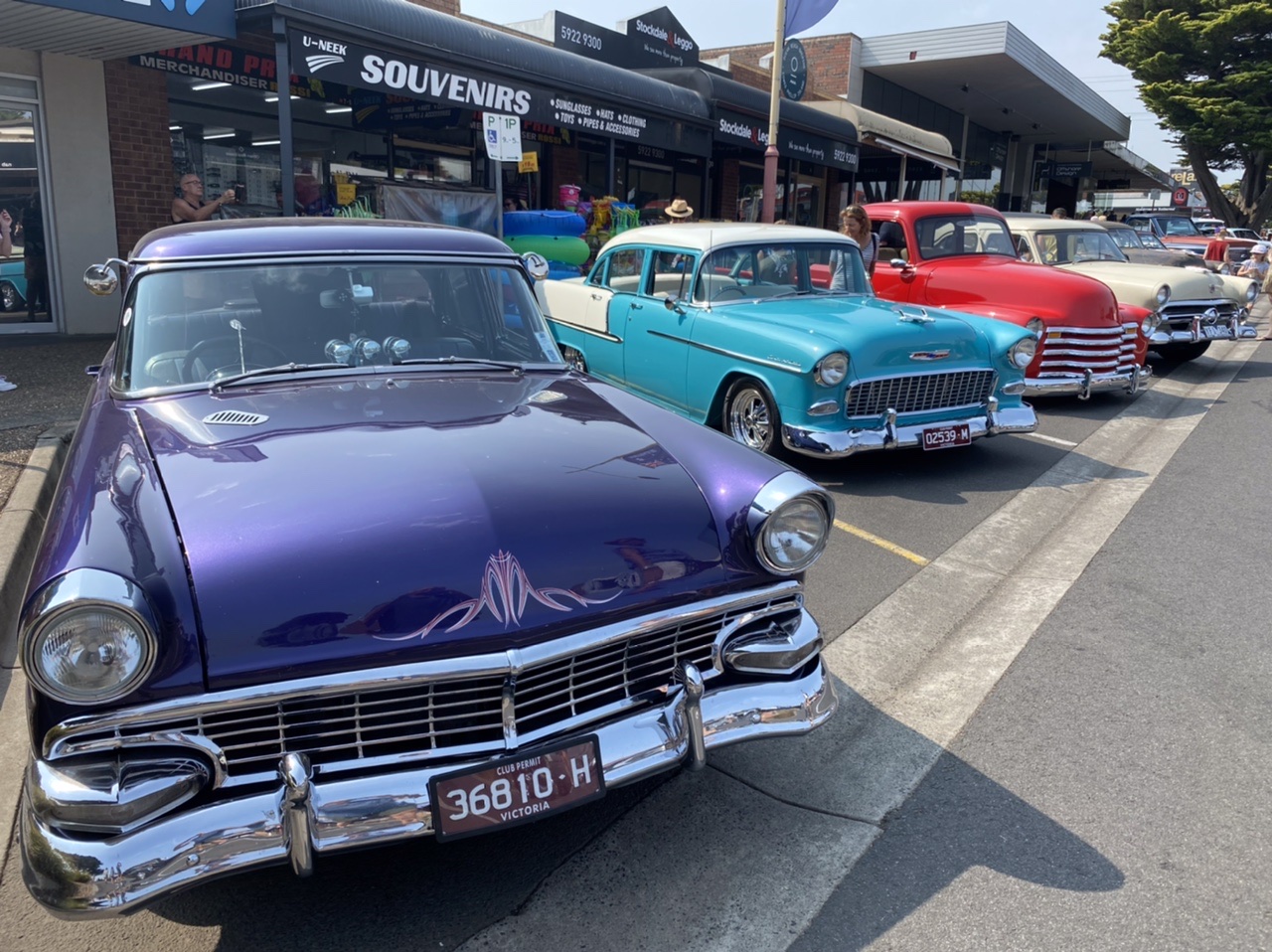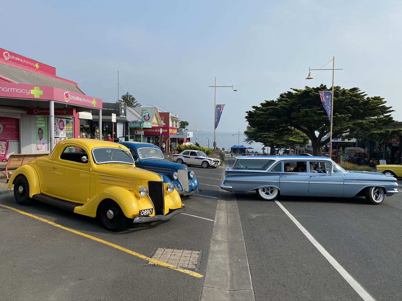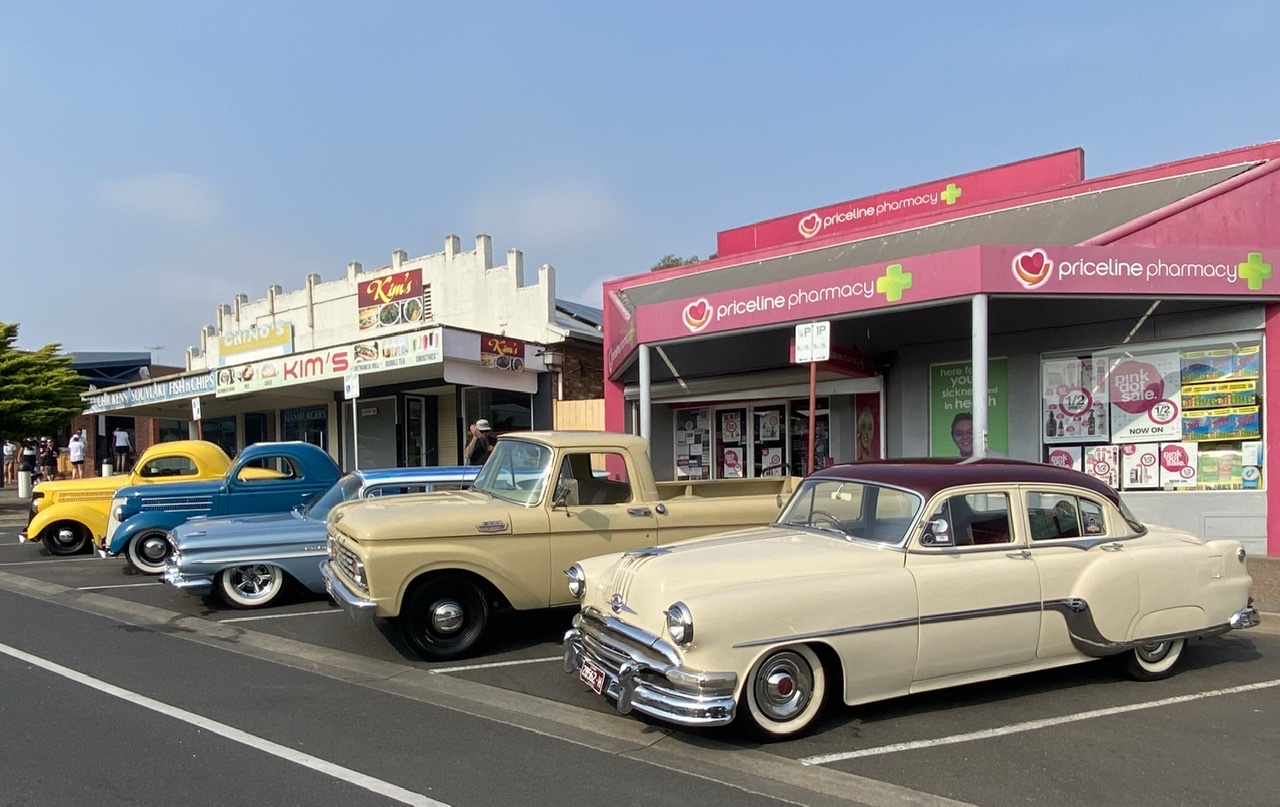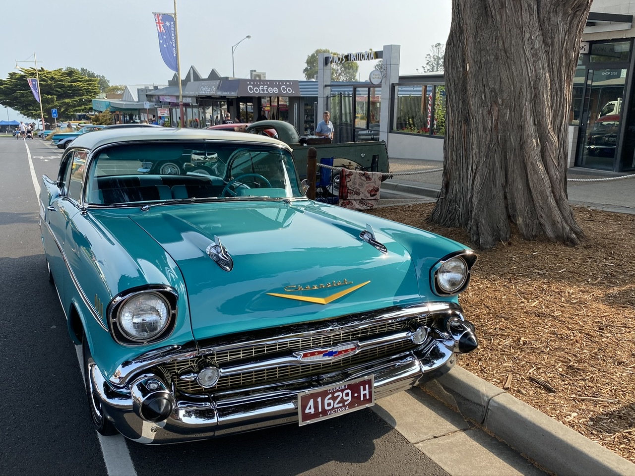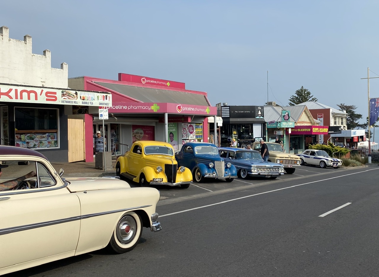 Phillip Island, die von San Remo (😉) über eine Brücke zu erreichende Insel, liegt ca. 100km von Melbourne entfernt und bietet ein kontrastreiches Programm, so dass man sie nicht richtig in irgendeine Kategorie von Urlaubsort einordnen kann. Da sind die Urlauber, die mit Sack und Pack auf die Campingplätze nahe der Badestrände ziehen, da sind die Naturliebhaber, die durch unberührte Teile der Insel wandern, da sind die Touristen aus aller Welt, die zu Hunderten zur berühmten allabendlichen Pinguinparade gekarrt werden und da sind an diesem Wochenende die Liebhaber alter Autos, die ihre herausgeputzten Karossen durch die Straßen lenken und zur Schau stellen.