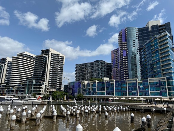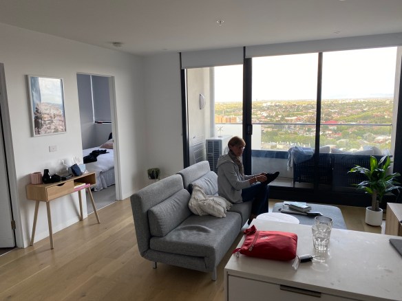 Wir erreichen Melbourne. Die zweitgrößte Stadt Australiens mit fast 5 Millionen Einwohnern erstreckt sich schier endlos mit ihren Vororten. Das Navi findet unsere Adresse St. Kilda St. 3 nicht, aber Hermas Navigationskünste führen uns dann doch zum Ziel. Es ist ein 25- stöckiges Gebäude mit zusätzlich 4 Ebenen Tiefgarage. Im Briefkasten finden wir die Box mit dem Code, darin die Schlüssel und in der 19. Etage auch unser Apartment für die kommenden 4 Tage. Es ist etwas spartanisch eingerichtet, hat aber alles was man braucht und bietet vom kleinen Balkon aus einen herrlichen Blick. Somit sind wir das erste Mal hoch hinaus in Melbourne.