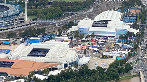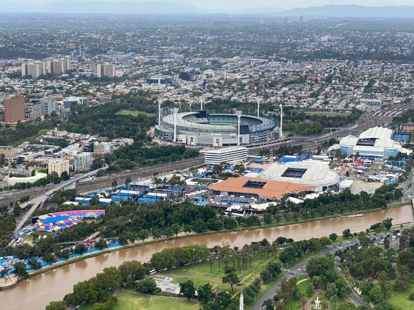 Das vermutlich höchste Gebäude Melbournes, welches wir als nächstes ansteuern, ist der Eureka Tower mit 89 Stockwerken. Das Ziel für unseren nächsten und dritten Ausflug nach oben. Im 89. befindet sich eine Bar und ein Restaurant, eins tiefer hat man einen grandiosen Ausblick über die Stadt. Wir sehen Downtown, die anderen Wolkenkratzer, hinunter auf den Yarra River, den großen Bahnhof Flinders Station. Am interessantesten ist jedoch der Blick auf die Anlagen der in diesen Wochen stattfindenden Australian Open, eins der vier Grand Slam Tuniere im Tennissport. Wir sehen die zahlreichen Centre-Courts, die sonstige Attraktionen, die den Tennis Fans geboten werden. Mit dem Fernrohr sehen wir die Anzeigetafel, die das drohende Aus der Mitfavoritin Serena Williams anzeigt. Ansonsten reicht der Blick weit über die Phillips Bay bis hin zum Wilson Prom.