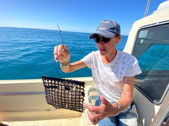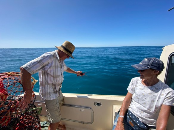 Auf das Thema Lobster sind wir gekommen, weil Andrew uns eingelädt, mit seinem Boot auf das offene Meer hinauszufahren und nachzusehen, ob sich der eine oder andere Lobster in den vom ihm ausgelegten Fangkörben „verirrt“ hat. Welch ein Angebot…. Eine halbe Stunde später geht es zu Fuss zu dem auf der anderen Straßenseite liegenden Hafen. Carolyn ist mit von der Partie. Das Boot ist schnell klar gemacht, das Wetter mit Sonne pur, tiefblauem Himmel und 23 Grad ein Traum. Kaum haben wir den Hafen verlassen, macht die Seefahrt richtig Spaß, denn – trotz ruhiger See, wie die beiden sagen – ist die Dünung der Wellen doch enorm. Es geht rauf und runter. Gut dass wir kein Problem mit der Seekrankheit haben. Nach gut einer halben Stunde erreichen wir die rot-weissen, kleinen Bojen, an denen sich die – in ca. 30m Tiefe – auf Grund liegenden Fangkörbe befinden. Andrew hat vier Körbe, die nacheinander hochgezogen werden. Die ersten drei sind leer. Im vierten dann ein Treffer, allerdings eine noch zu junge und zu kleine Lobster-Dame. Wir freuen uns, dass sie nach kurzer Begutachtung wieder in ihr Element zurück darf. Auf dem Rückweg sitzen wir hoch oben auf dem Oberdeck und genießen den Ausblick auf Meer und Hafen.