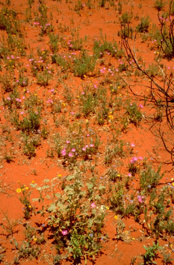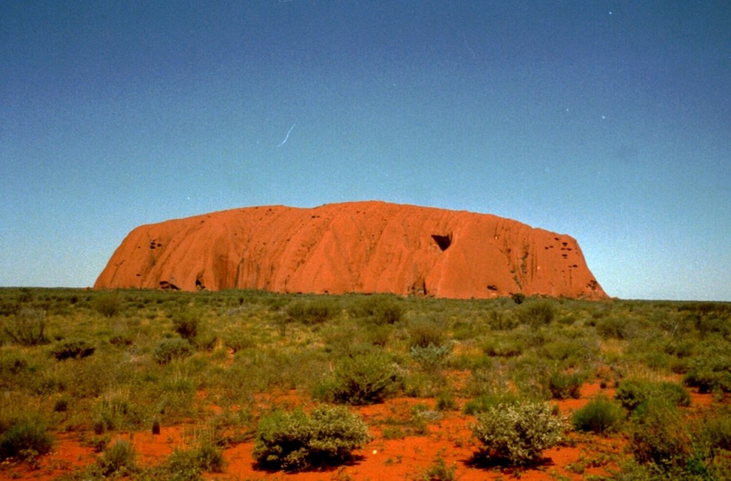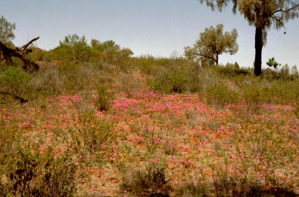 Per Inlandsflug ging es weiter in das rote Zentrum nach Alice Springs und per 4-Wheel-Drive 450km durch das tiefste Outback zum Ayers Rock. Eine geplante Ballonfahrt musste wegen zuviel Wind leider abgesagt werden. Dennoch war der Monolith mitten in der Landschaft sehr beeindruckend. Die Fahrt durch das Outback zum Rock und weiter zu den Olgas (Kata Tjuta) war spektakulär, zumal aufgrund des Regens in den Wochen zuvor die Sandwüste von blühenden Pflanzen geprägt war.