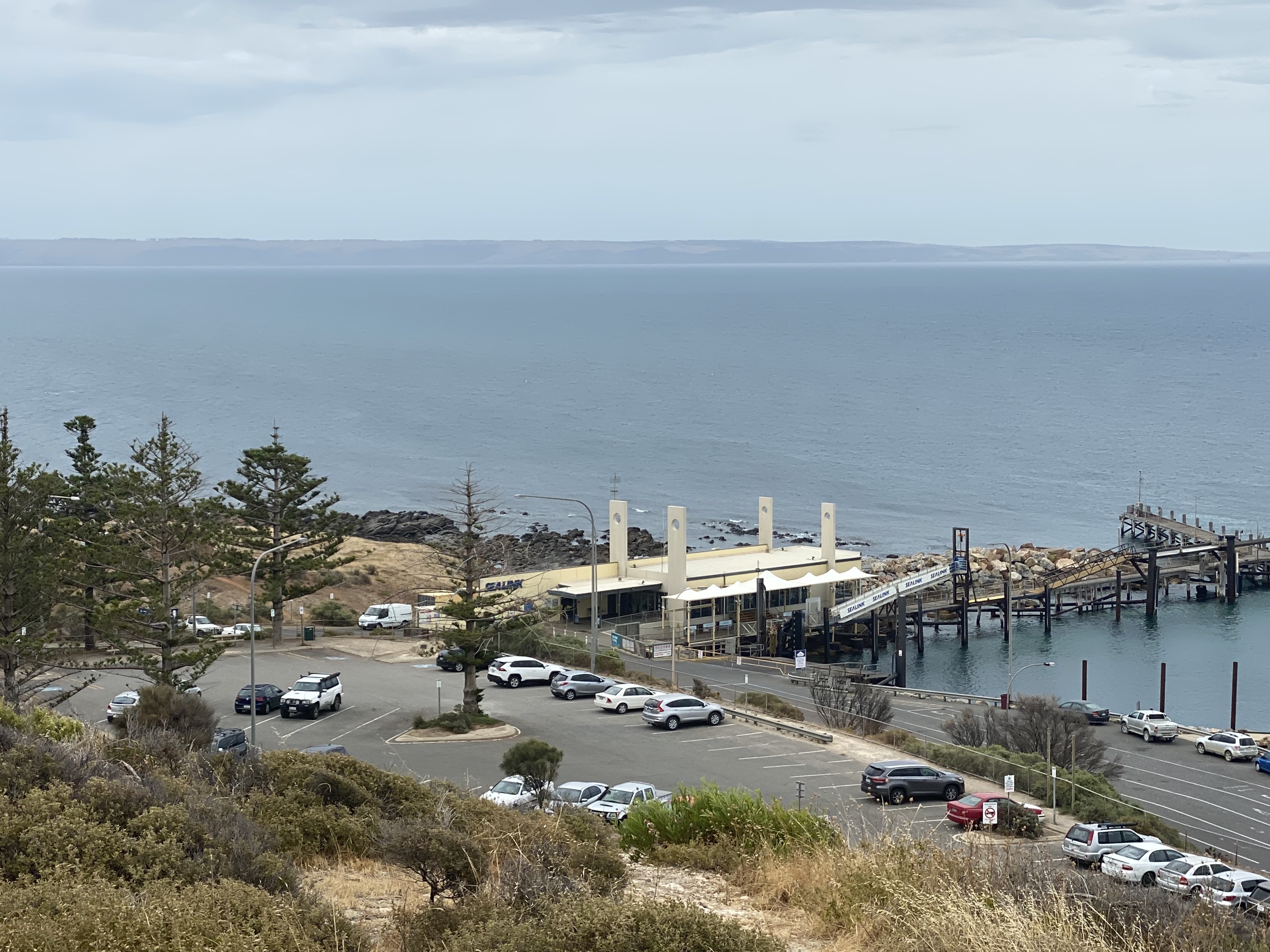 Wir fahren auf leeren Straßen die kurze Distanz von Victor Harbour nach Port Jarvis. Der recht trostlose Ort wäre ohne jegliche Bedeutung, wäre er nicht der Fährhafen zu Kangaroo Island. Wir sind auf die 11.30 Fähre gebucht: 30 A$ pro Person und 200 A$ für unseren Tiguan – nicht gerade preiswert (175€ umgerechnet), aber immerhin für hin und auch zurück. Dafür wird man von sechs Mann unterstützt, mm-genau einzuparken. Gut 45 Minuten dauert die Überfahrt durch die oft stürmische Backstair Passage, die sich heute jedoch recht friedlich zeigt.
